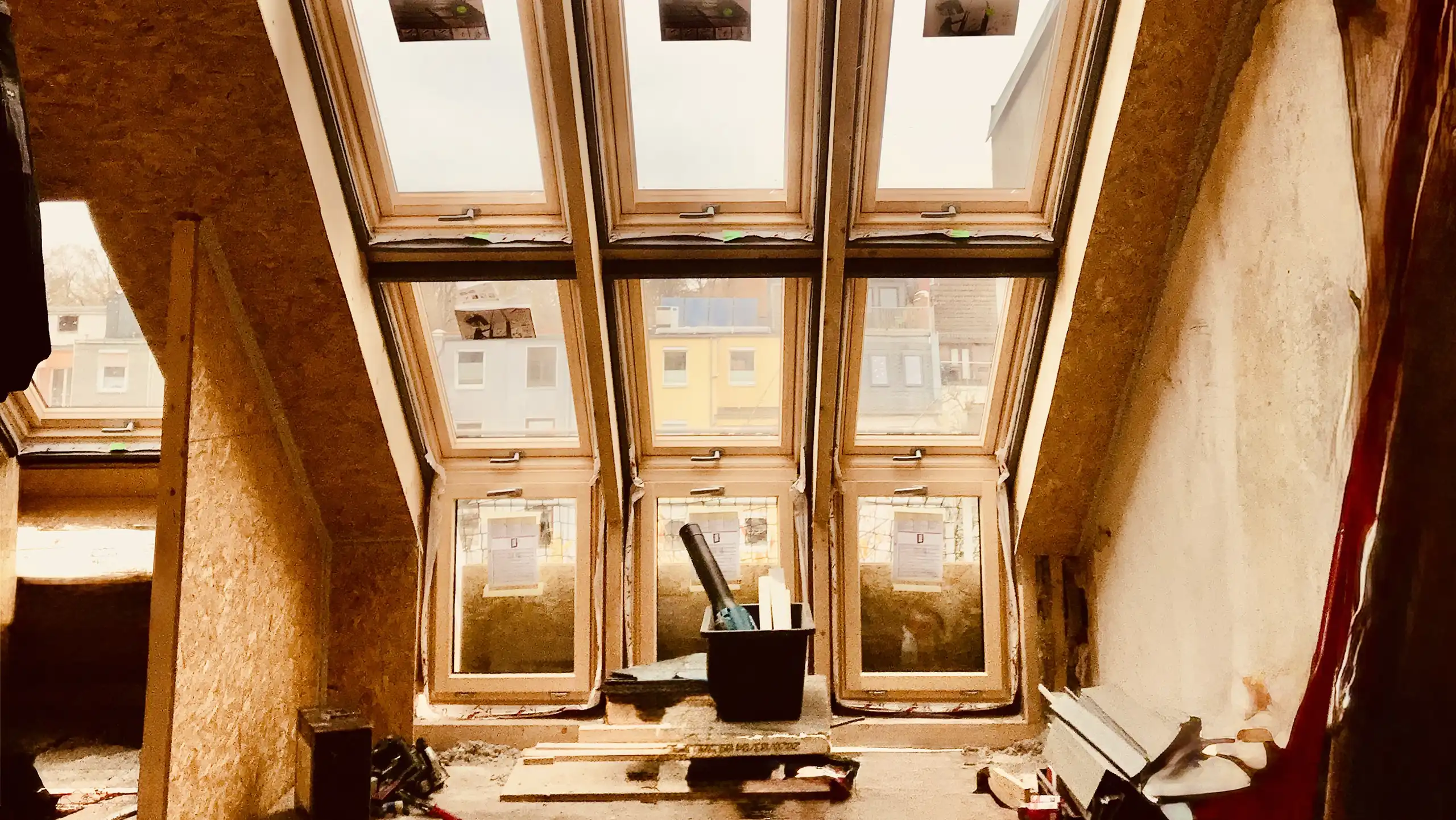 Im Zuge der Sanierungsmaßnahme wurden hochwertige Dachflächenfenster eingebaut, bestehend aus einer 9-teiligen Fensterkassette mit drei integrierten Fassadenelementen sowie einer 2-er und einer 3-er Kombination in Eindeckrahmen-Ausführung. Diese Lösung sorgt für eine großzügige Belichtung und eine harmonische Integration in die Dachfläche.